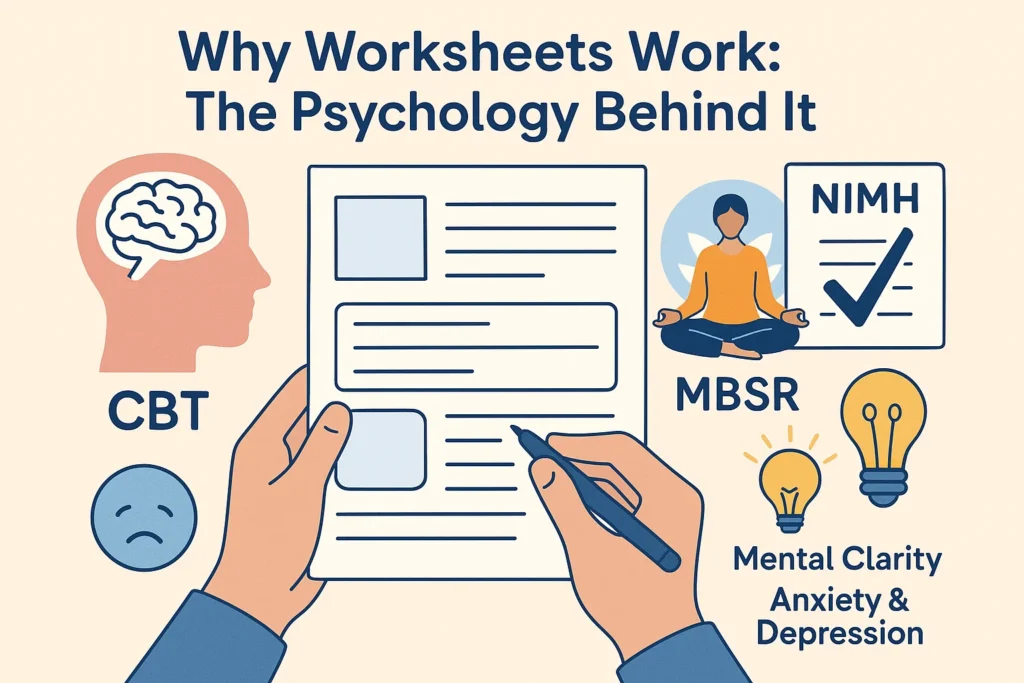 Mental health professionals rely on worksheets because they reinforce proven psychological practices like Cognitive Behavioural Therapy (CBT) and Mindfulness-Based Stress Reduction (MBSR). In fact, research published by the National Institute of Mental Health (NIMH) supports that structured self-reflection tools significantly enhance mental clarity and reduce symptoms of anxiety and depression.